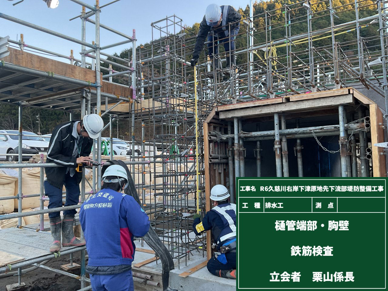 川裏端部に続いて、樋管端部・胸壁の鉄筋検査を行いました。